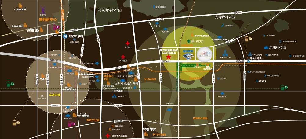 环绕文化设施区、商业聚集区等,是光谷城市多重资源集合的焦点。